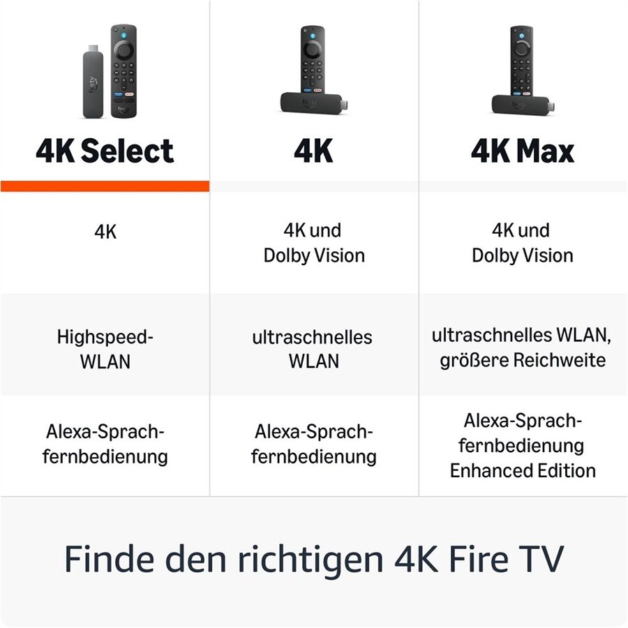 NordVPN, MagentaTV, 1&1 TV & Filme, Xbox and Amazon Luna sind bald auf dem Fire TV 4K Select verfügbar. Für mehr Sicherheit können nur Apps aus dem Amazon Appstore auf Fire TV heruntergeladen werden. Die Alexa-Sprachfernbedienung ist mit vier vorprogrammierten App-Tasten ausgestattet, einschließlich Prime Video und Netflix. Die anderen zwei App-Tasten variieren. Die meisten Xbox-Spiele auf Fire TV erfordern ein Xbox Game Pass Ultimate-Abonnement. Um Xbox-Spiele auf Fire TV zu spielen, ist ein kompatibler Controller erforderlich. Beide sind separat erhältlich.