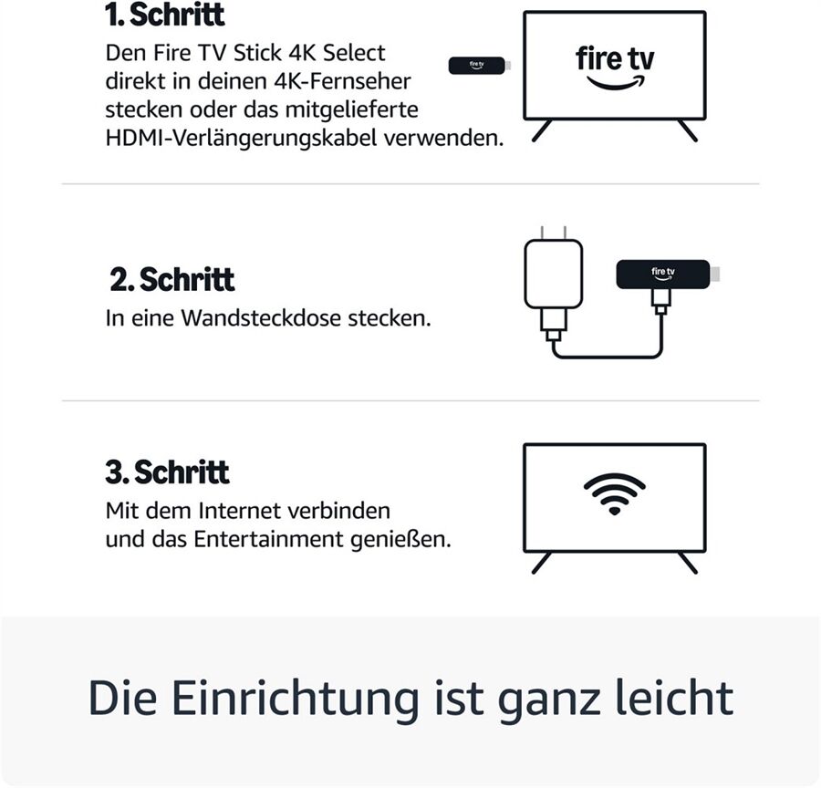 Den Fire TV Stick 4K Select direkt in deinen 4K-Fernseher stecken oder das mitgelieferte HDMI-Verlängerungskabel verwenden.