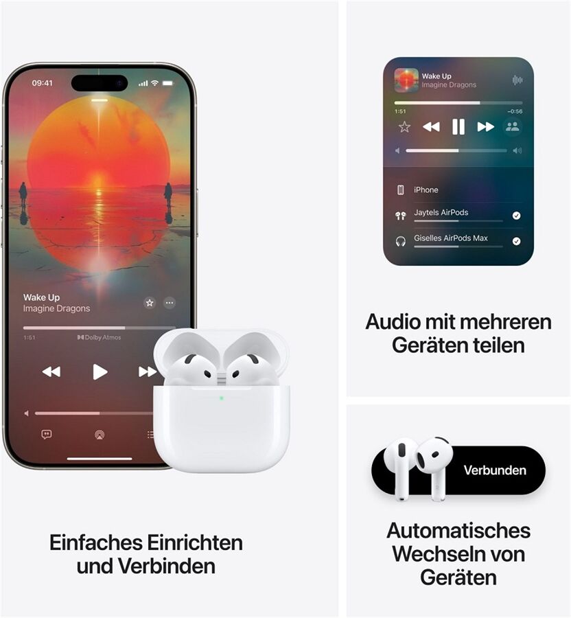 Bitte bei Bildern, die die Batterie zeigen, den folgenden rechtlichen Hinweis hinzufügen: Die Batterielaufzeit hängt von den Geräte-Einstellungen, der Umgebung, der Verwendung und vielen weiteren Faktoren ab. Bitte bei Bildern, die Einrichten mit einem Fingertipp, automatisches Wechseln von Geräten und Audiofreigabe zeigen, die folgenden rechtlichen Hinweise hinzufügen: Erfordert ein kompatibles Apple Gerät mit dem neuesten Betriebssystem. Die Kompatibilität variiert je nach Feature. Einrichten mit einem Fingertipp und automatisches Wechseln von Geräten erfordern einen iCloud Account.