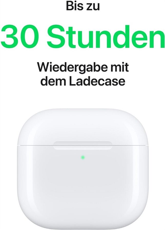 ⁹ Die Tests wurden von Apple im Juli und August 2024 durchgeführt mit Prototypen von AirPods 4 (Aktive Geräuschunterdrückung) mit kabellosem Ladecase, die mit Prototypen von iPhone 16 Pro Max Geräten verbunden waren; alle mit Software-Prototypen. Die Wiedergabeliste umfasste 358 einzelne Audiotitel, die im iTunes Store gekauft wurden (256 kbit/s AAC). Die Lautstärke war auf 50 % eingestellt. 3D Audio, Konversationserkennung und Geräuschsteuerung waren deaktiviert. Bei auf Aktive Geräuschunterdrückung eingestellter Geräuschsteuerung war die Wiedergabe bis zu 4 Stunden. Bei den Tests wurde die Batterie der AirPods komplett durch Audiowiedergabe entladen, bis der erste AirPod die Wiedergabe einstellte. Die Batterielaufzeit hängt von den Geräte-Einstellungen, der Umgebung, der Verwendung und vielen weiteren Faktoren ab.
