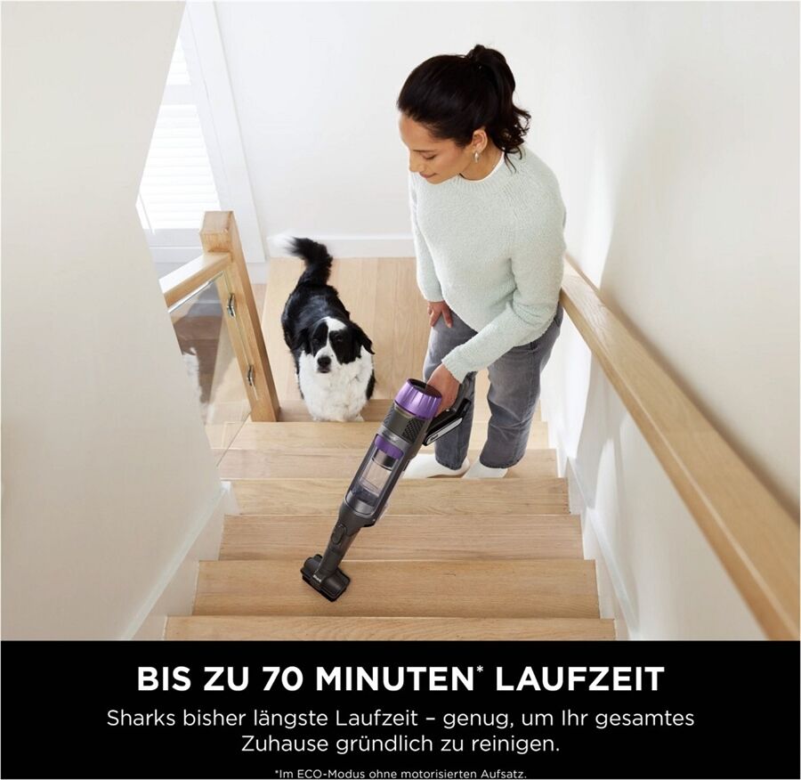 Zudem kann der selbstentleerende Staubsauger mit einer Laufzeit von bis zu 70 Minuten† auch längere Reinigungseinsätze bewältigen.