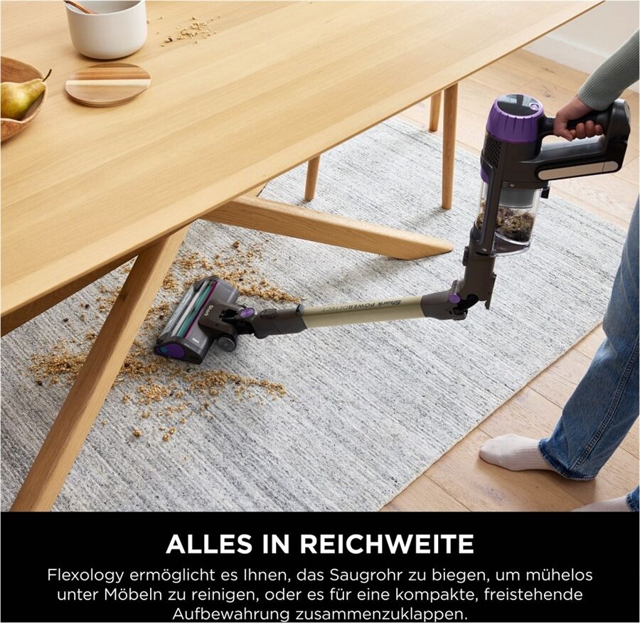 Alles in Reichweite: Flexology ermöglicht es Ihnen, das Saugrohr zu biegen, um mühelos unter Möbeln zu reinigen, oder es für eine kompakte, freistehende Aufbewahrung zusammenzuklappen.